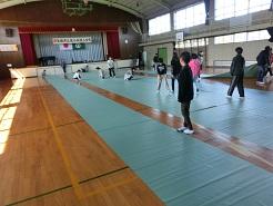 ここは2年生教室、床に座って、足を伸ばし、腰をひねっていますね。