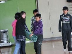 体育館の端に企画委員の子が立っています。袋を持っていますね。