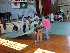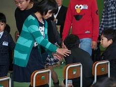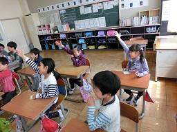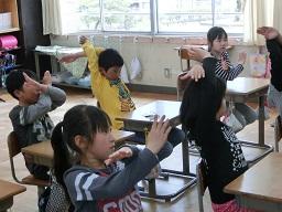 最後に伸びを大きくします。これで終わりです。2年生の教室には、4年生と5年生の体育委員さんが来てくれました。