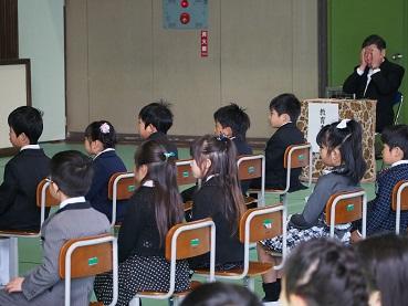 どこでも歓迎のムードで盛り上がり、歓迎会が盛大に行われました。ところが太平洋戦争が起きてしまいました。アメリカと戦争になったのです。青い目の人形は敵国の人形だと「こわせ」「もやせ」などほとんどの人形は壊されてしまいました。今日本に残っているのは330体くらいです。そして、今年の泉小学校の子どもは、「なかよくする」ことを大きな目標にしました。周りの友だちといつも仲が良くないと何をやっていもうまくいきません。素晴らしい泉小にするために「友だちとなかよく」これが今年の大きなテーマです。