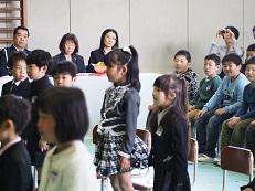 始業式の後、児童の作文発表がありました。各学年の代表の子が発表しました。上の右の写真は2年生の発表です。