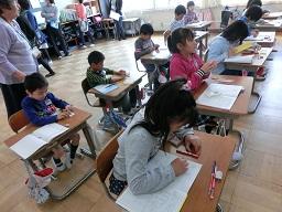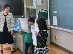 先生「勝負は、うさぎの勝ち。かめは途中で摘んだきれいな花をプレゼントしました。」子供たちはかめの気持ち、うさぎの気持ちを考えながら楽しそうに勉強していました。