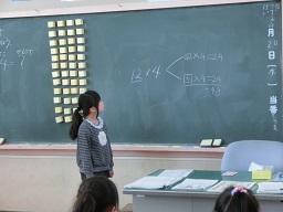 3年生は算数です。めあては「いろいろな求め方で12×4の答えをもとめよう。」です。