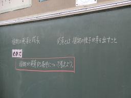 5年生は理科の勉強です。今日のめあては「植物が発芽する条件について考えよう」です。グループになって考えていますね。
