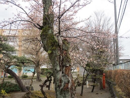 3月30日(水)、校庭のサクラの花がいくつか開き始めていました。