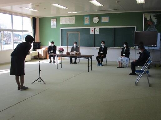 クラスごとにそれぞれの教室に分かれてオンラインで実施しました。式後、