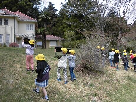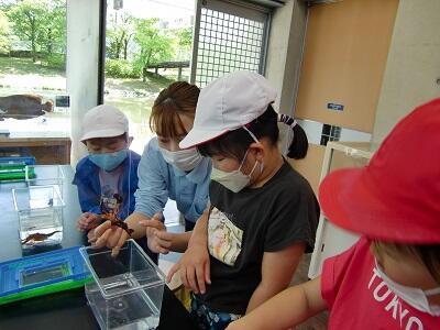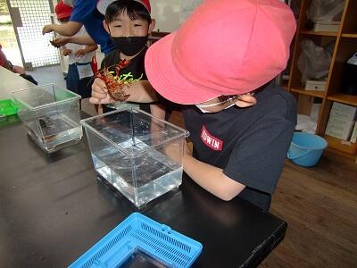 きました。ビュンビュンごま作り、ザリガニの観察、園内見学、