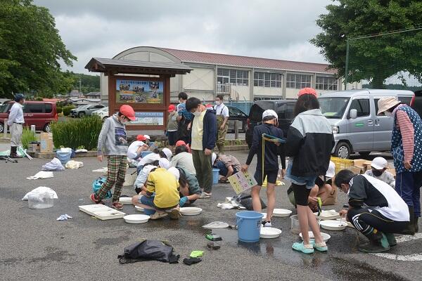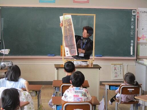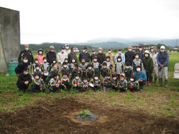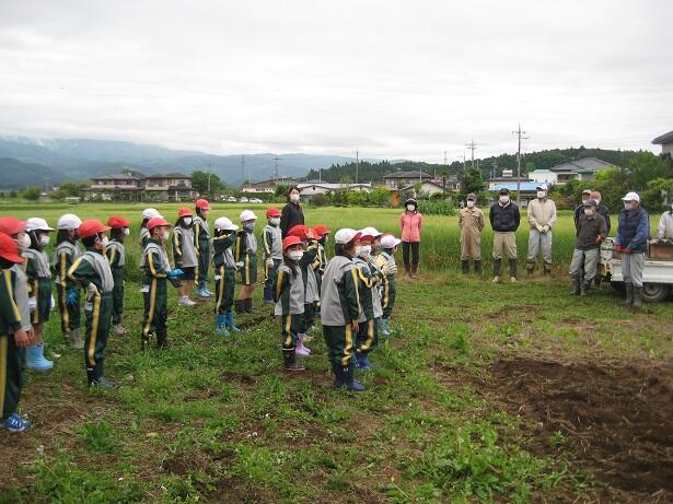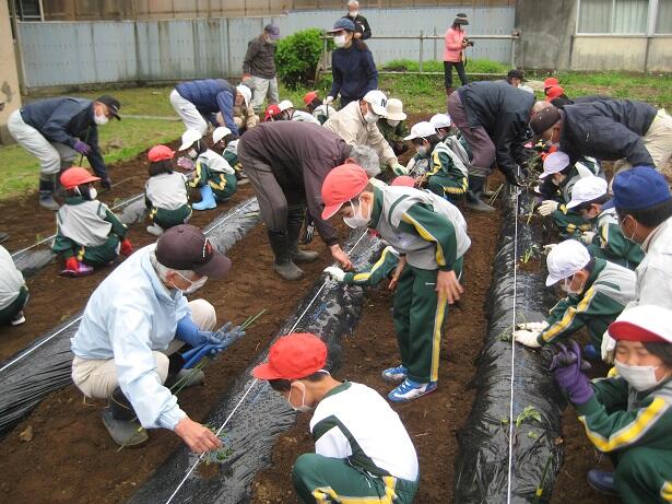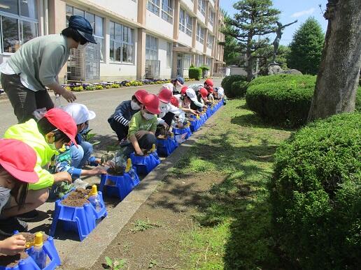 5月16日(月)、1・2年生が、2校時にサツマイモの苗の植付をしました。水の郷泉を守る