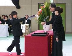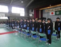 卒業証書をもった6年生です。1年生が大きな声で呼びかけます。