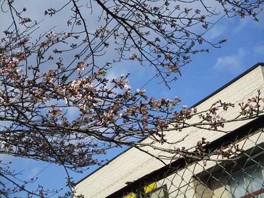 3月23日(火)、校庭の桜の花が咲いているのを見つけました。