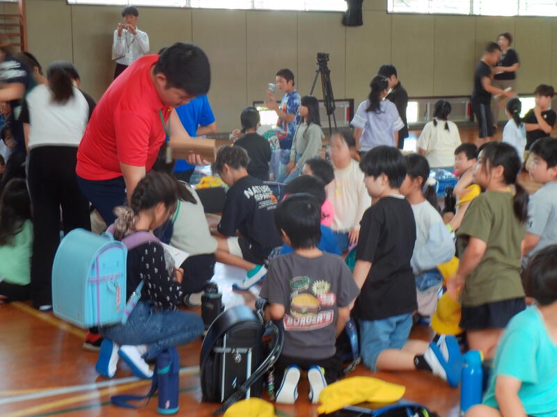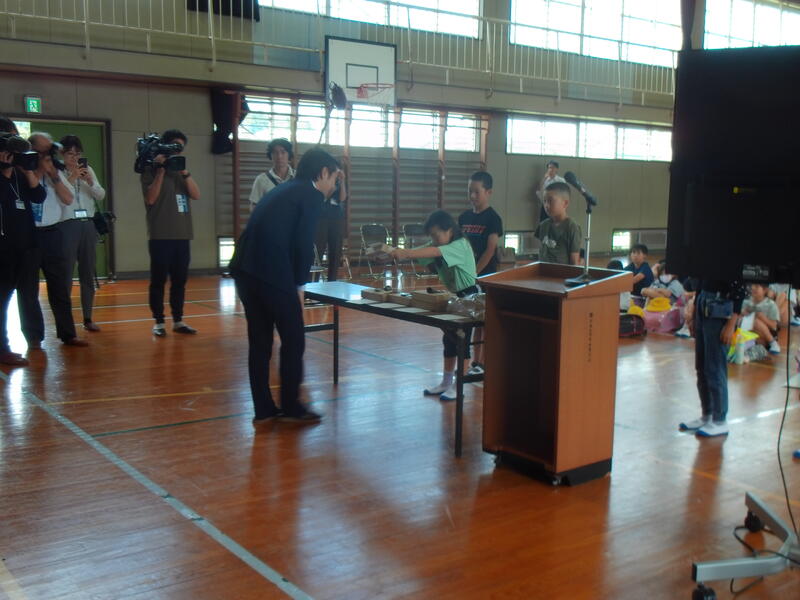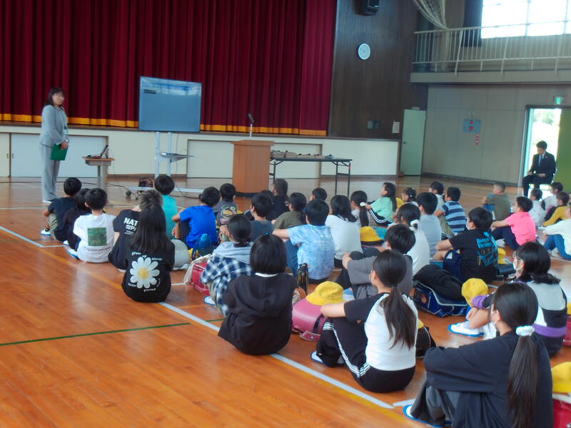 本日、5校時に寺山遠足事前安全ミニ集会を行いました。初め、学校から「寺山遠足」の歴史や熊にあった時の対処方法をなどを話をして、その後、市長から子どもたちに「熊よけの鈴」の贈呈式を行いました。
