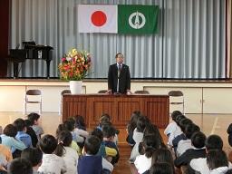 学校長の話です。この日は2つの話をしました。一つは、春休みは交通事故に気を付けて生活すること。もう一つは新しい学年になったら、協力してもっといいクラスを作ることです。