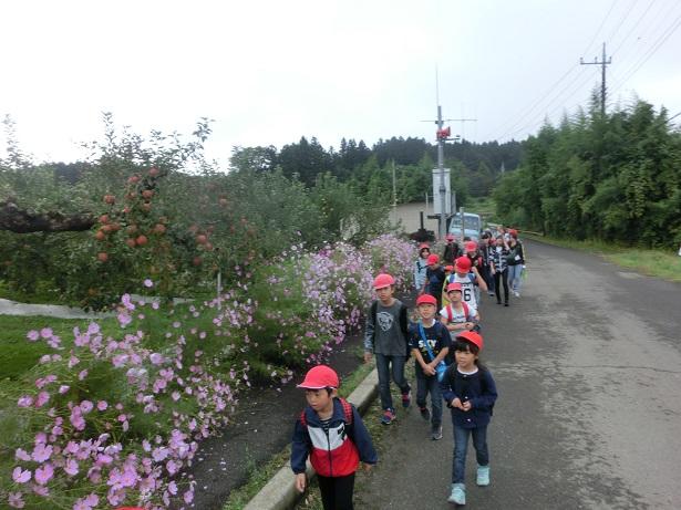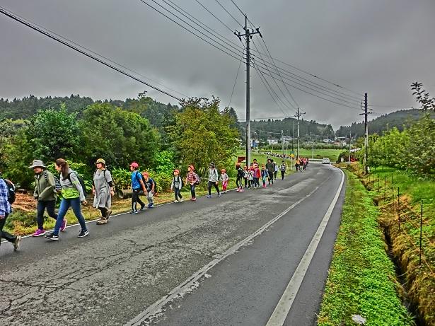 お昼を食べた後は、一気に平野の公民館まで下ってきました。雨の心配もあったので、ちょっと早いペースでの折り返しとなりました。ここからはゴールの学校までもう一息です。