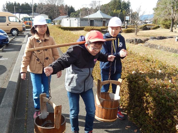 高学年の児童代表が目標に向けて放水しました。消火のコツは燃え盛る火を消すのではなく、火元を消すことということでした。