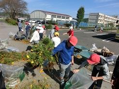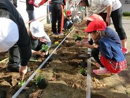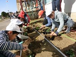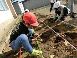 パンジーはポットから外したら、根を少しほぐしてから植えます。子供たちちゃんとやっていますね。