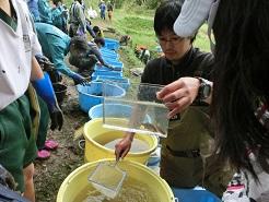 大学の先生が浅瀬でドブガイを見つけました。子供たちも残っている生き物を探し始めました。