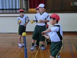 今日は天気もよく、外で思い切りできます。このティーボールは中学年の体育の運動として取り上げられています。