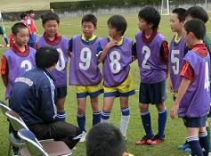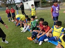 ハーフタイムに先生の話を聞く子供たちです。