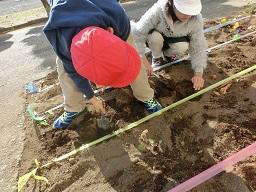 球根は植える向きが決まっています。上と下を間違わないようにちゃんとやっています。