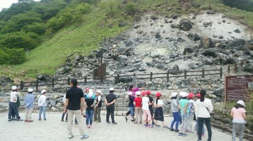 那須高原自然の家を退所して、殺生石を見学しました。まだ雨が降らなかったので、近くまで行けました。これから無事学校に帰ります。