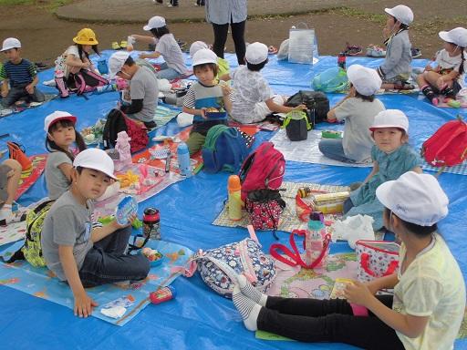 涼しい木陰にブルーシートを敷いて、みんなでお楽しみのお弁当です。