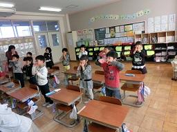 動きを付けています。体の部分の名前を覚えた1年生が難しいことに挑戦しています。