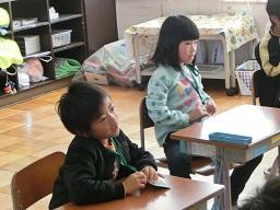火曜日のEnglishの時間の続きです。今度は担任の先生がカードを少しずつ見せながら出しています。「なにかな?」