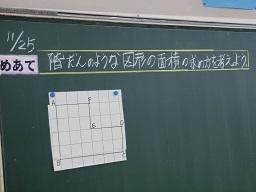 今日はこの形の面積を求めます。めあては子ども達と先生が話し合って「階段のような図形の面積の求め方を考えよう」となりました。