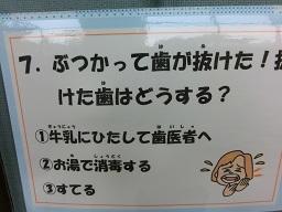 8/29 保健室掲示1 投稿日時 : 2017/08/29 泉小学校管理者 カテゴリ: 保健室の掲示が変わりました。もうすぐ運動会、ヒアリなどの話題の他に「救急クイズ」があります。 例えばこんなクイズです。つき指の正しい手当は?①ひっぱる②冷やす③温める 三択です。答えは②冷やす。 では、ぶつかって歯が抜けたときは、抜けた歯はどうする?①牛乳に浸して歯医者へ、②お湯で消毒する、③捨てる答えは右の写真です。理由も書いてあります。 {{options.likeCount}} {{options.likeCount}}