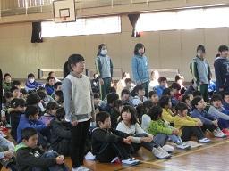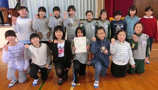 次は矢板市のバスケットボール大会5年生の部で優勝した5年、4年チームの表彰です。キャプテンと副キャプテンが代表で表彰を受けました。後ろではバスケット大会で優勝した子供たちが立っています。