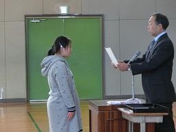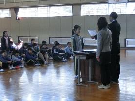 先週15日(木)に表彰集会を行いました。まず、歯と口の健康作品(標語の部)で優秀賞に輝いた1年生MRさんです。