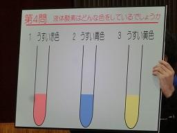 10/23 サイエンスショー11 投稿日時 : 2017/10/23 泉小学校管理者 カテゴリ: 今度は第4問です。「液体酸素はどんな色でしょう?」 子供たち手を挙げていますね。では実験です。酸素を集めています。そしてそれを冷やします。 よくは分かりませんが、薄い青です。 この「液体酸素をに火をつけるとどうなるか」が第5問です。結果はこんなに激しく燃えました。酸素は液体になっても燃えるのです。 {{options.likeCount}} {{options.likeCount}}