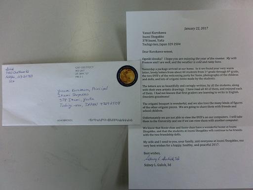 昨日家に小包が届きました。その中にはあなた方の心のこもった手紙、かわいらしい1年生から6年生まで40人あまりの子供たちが書いた手紙、そしてスージーの歓迎会の2本のDVD、また子供たちと青い目の人形たちの写真、さらに子供たちの手作りのたくさんの折り紙の品々がありました。