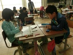 11/19 1年生算数2 投稿日時 : 2016/11/19 泉小学校管理者 カテゴリ: この日の勉強は「12-3をけいさんしよう」です。さっそくグループになってやり方を考えます。 考えたグループは、ホワイトボードにまとめていきます。 書く人はグループごとに順番で毎回変わって行きます。 このグループはこんなふうに書きました。「2から3は引けないから、12を10と2にわける。10から3を引いて7、2を足して9です。」続きはあしたお届けします。 {{options.likeCount}} {{options.likeCount}}
