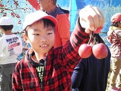 そこでリンゴやさんに寄りました。大きなおいしそうなリンゴもたくさんありましたが、子供たちの目を引いたのは小さな「姫りんご」でした。
