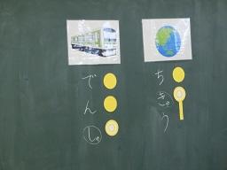 黒板には「ちきゅう」「でんしゃ」が書いてあります。「でんしゃ」を例にすれば、「しゃ」という音が「拗音(ようおん)」です。この子は発音して両手を組んで少しねじっています。「拗(よう)」は「ねじれる」という意味です。だから子供には両手を組んでねじるようにさせて「ねじれの音」と教えています。