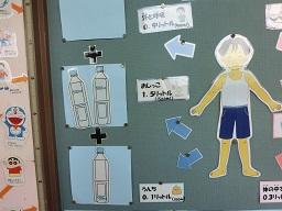 7/7 保健室掲示・後半 投稿日時 : 2017/07/07 泉小学校管理者 カテゴリ: 昨日の続きです。今回は熱中症対策です。 人の体から出る水の量です。おしっこで1.5㍑出ます。その他、汗、うんちなどにも水分は出て来ます。ですからその分必要な水の量があります。夏は運動や仕事をするとその量は多くなります。そこで壁面の対策が必要になります。①のどの渇きを感じる前に飲む。 ②少ない量をこまめに摂る。そして塩分もこの時期必要だそうです。子ども達に毎日見てもらっています。 {{options.likeCount}} {{options.likeCount}}
