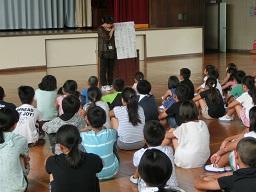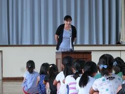 子どもたちはよく聞いています。次に児童指導の先生から話がありました。①交通事故②水の事故③花火の事故、そして夏休みの生活(遊びに行く時間、お昼は家で、帰る時刻)について話がありました。最後に学校長から