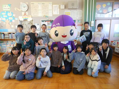 「ともなりライブラリー」の読書推進イベントのPRのために、ともなりくんが、来校しました。図書の係の先生からイベントについてお話を聞き、ともなりくんと一緒に記念撮影。みんなが笑顔になるひと時でした。