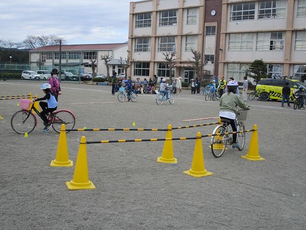 後半は、校庭に設置された「一本橋、スラローム、くの字」のコースで自転車の運転技術向上の活動になりました。
