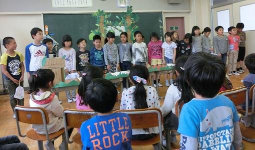 動画を見ていただくとお分かりになると思いますが、ステージの上の子が「猛獣狩りに行こうよ。」というとフロアの子供たちがそれに答えて「猛獣狩りに行こうよ。」と続けて言います。