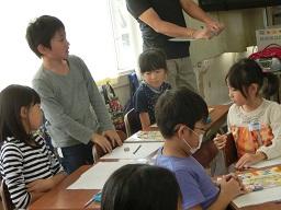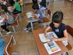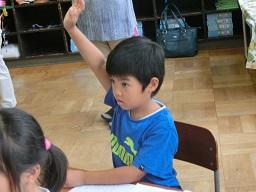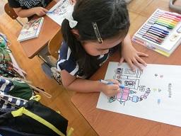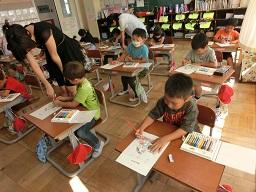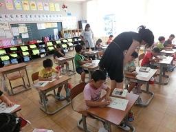 先生はこんなふうに言います。「真四角を赤で塗ってください。」もちろん英語です。子供たちは楽しそうに言われた形に指定された色を塗っていました。