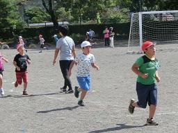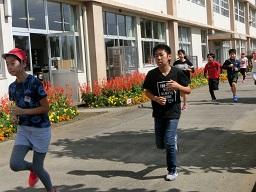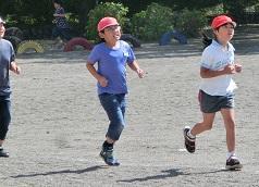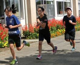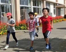 下の学年はトラックを走ります。上の学年は校庭の外周を走ります。