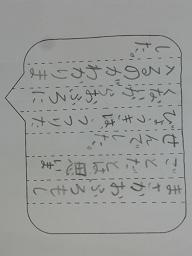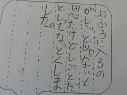 子供たちが授業の終わりごろ「じゅういさんがお風呂に入ること」について書いた文章を紹介します。「おふろに入るのがしごとじゃないと思ったけど、しごとだとしってなっとくしました。」もう一つは「まさかおふろもしごとだとは思いませんでした。びょうきはうつりたくないから、おふろに入るのが分かりました。」