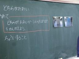 この日の勉強のめあてが黒板に書かれています。「どちらが多く入るかな?」