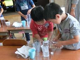 今度はちがう方法で実験をします。だからいったん水を捨てて、ペットボトルに新たに水を入れます。流し場での作業です。