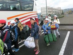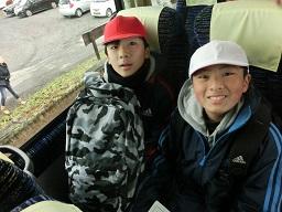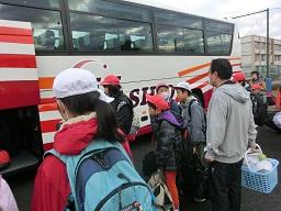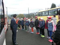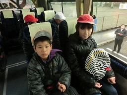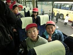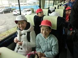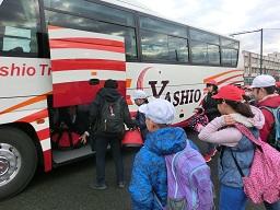 胸はわくわくしながら新しいバスに乗り込む5年生です。