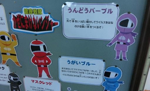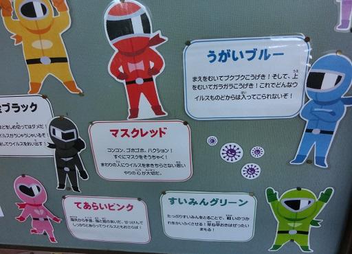 昨日の続きです。たくさんの健康戦士がいますが、今日は手洗いピンクです。ピンクレンジャーは「指先から手首と指と指の間、石けんでしっかり洗ってウィルスとさらば!」と言っています。次はマスクレッドです。レッド戦士は「コンコン、ゴホゴホ、ハクションすぐにマスクを装着!」