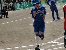 2回の攻撃の続きです。3年生のOKさん、バントを1塁側に転がしました。とても良いバントができて、ヒットになりました。そしてホームインもしました。バッターは3番、EMさんです。