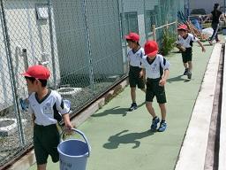 4年生男子もバケツを持ちました。プールの入っていきます。